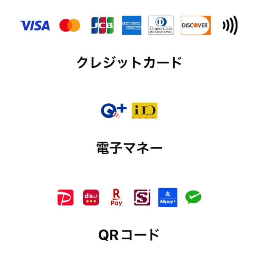 VISA、MASTER、JCB、AMEX、Diners、Discover + QUICPay が利用可能です。